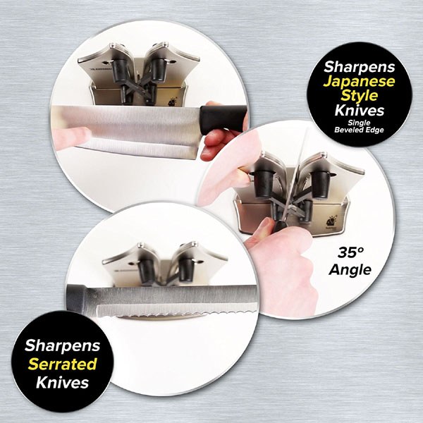 Whether it’s your kitchen knife, serrated knife, or even a Japanese blade — it gets razor-sharp in seconds.